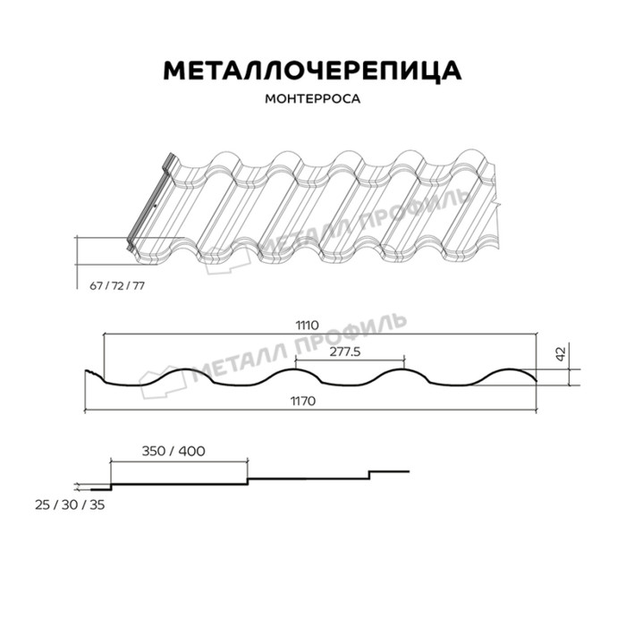 Металлочерепица Монтерроса® выпускается на современном оборудовании мирового класса. Это значит, что вы гарантированно приобретаете долговечную и надёжную кровлю из металла. Данный профиль гармонично сочетает в себе высокий рельеф и округлость очертаний. Несмотря на глубину волны, места соединений металлочерепицы практически неразличимы благодаря технологии 3D-реза. Модифицированные боковые крепления гарантируют герметичность соединений. Чтобы подчеркнуть индивидуальность своего дома, при покупке черепицы вы можете выбрать высоту ступеньки (25, 30 или 35 мм) и её длину (350 или 400 мм). Металлочерепица Монтерроса® изготавливается с различными покрытиями из линейки компании «Металл Профиль». Таким образом, ваша кровля приобретает долговечность и благородный внешний вид.